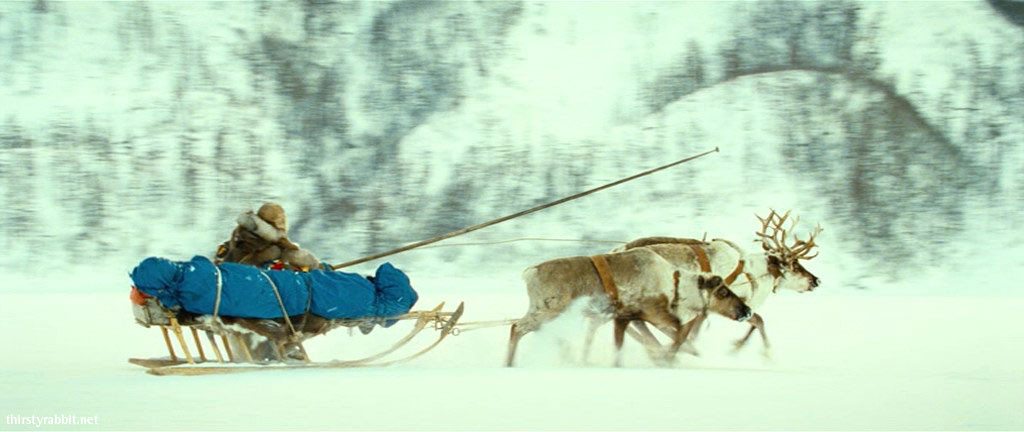 The film starts with a brief yet funny sequence, when the dogs bolt along with the sleigh when their master slept. He wakes up and runs after them in the nude. There is also a scene featuring an Eskimo girl (Tamara Obutova) going about her chores half-nude, apparently in accordance to tradition. She puts on a shirt only after noticing that the stranger that they rescued had woken up.